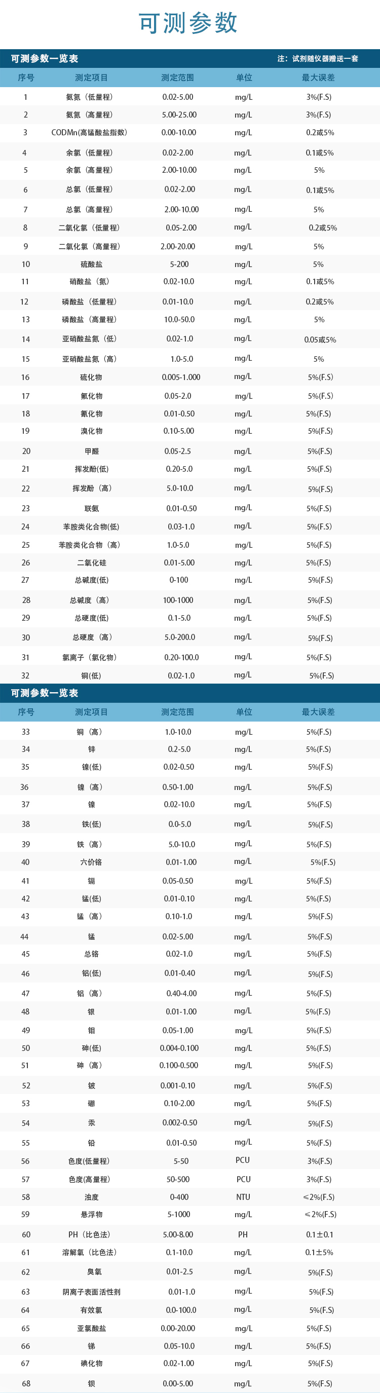 以采用進口窄帶冷光源的ERUN-ST-MU97臺式多參數(shù)水質(zhì)測定儀和ERUN-SP-M9000便攜式多參數(shù)水質(zhì)測定儀為例,能夠檢測COD、濁度、PH、余氯、硬度、懸浮物、氨氮、溶解氧、電導(dǎo)率、總磷、重金屬、溶解性總固體、色度、有機物、堿度、陰離子表面活性劑、無機鹽等參數(shù)指標,能夠適用于各種不同領(lǐng)域和工況場所的取樣化驗室檢測方式或戶外現(xiàn)場取樣檢測方式等快速檢測方法。